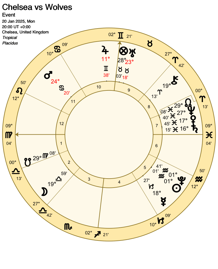 Jupiter (for Wolves) is in the 10th house (one of the houses representing Chelsea). Were Jupiter nearer to the 10th house cusp (within 2-3 degrees) this would depict Wolves in the power of Chelsea. However, even applying retrograde closer to the 10th house cusp, Jupiter is too far away for this to signify.