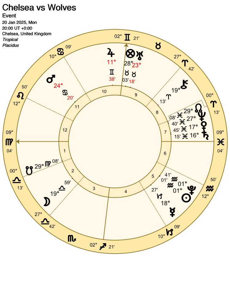 Pluto is combust (within 8 degrees of the Sun), which is a serious affliction. Whether this will mitigate or increase Pluto’s baleful influence remains to be seen. Either way, it seems likely that Wolves will prove stronger opposition than the pundits expect, and a win for Chelsea is far from guaranteed.