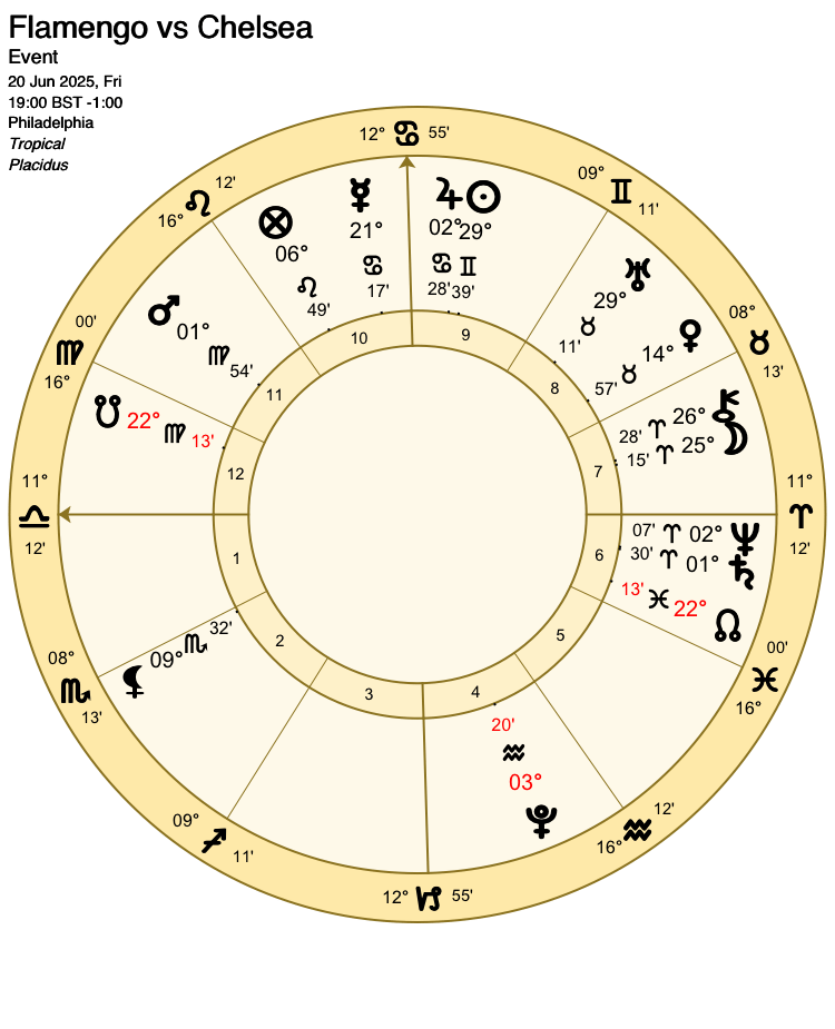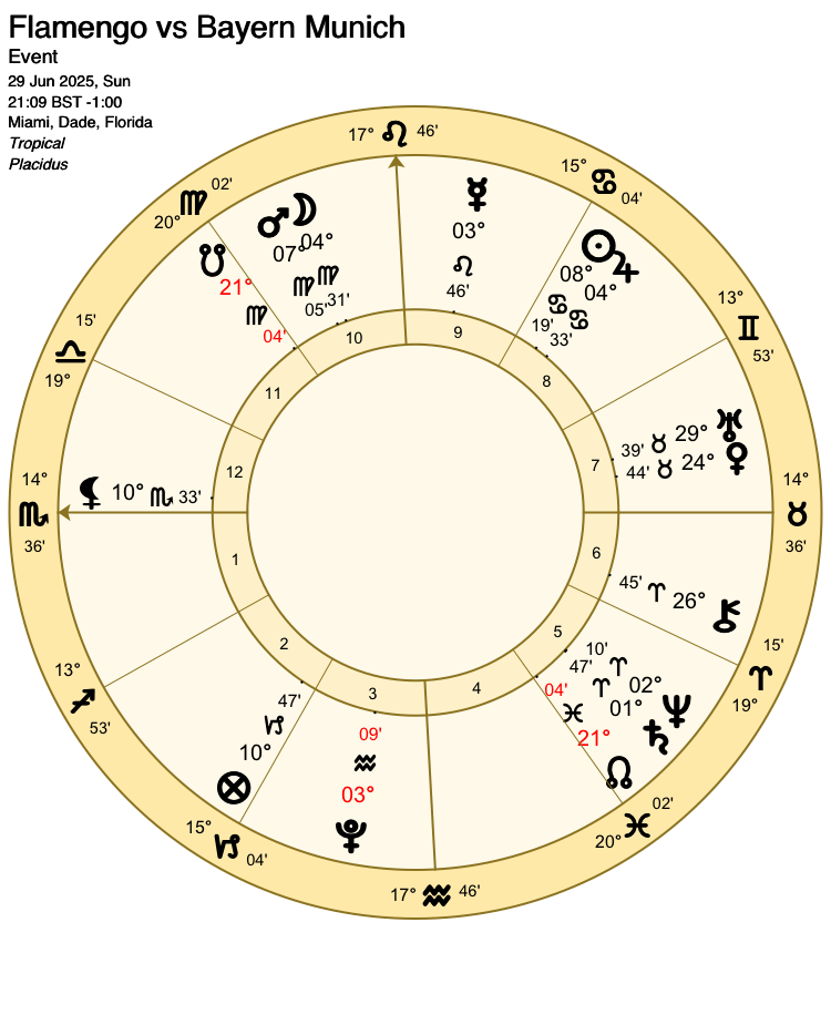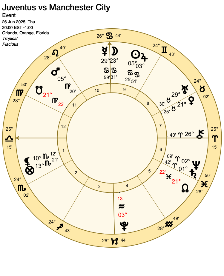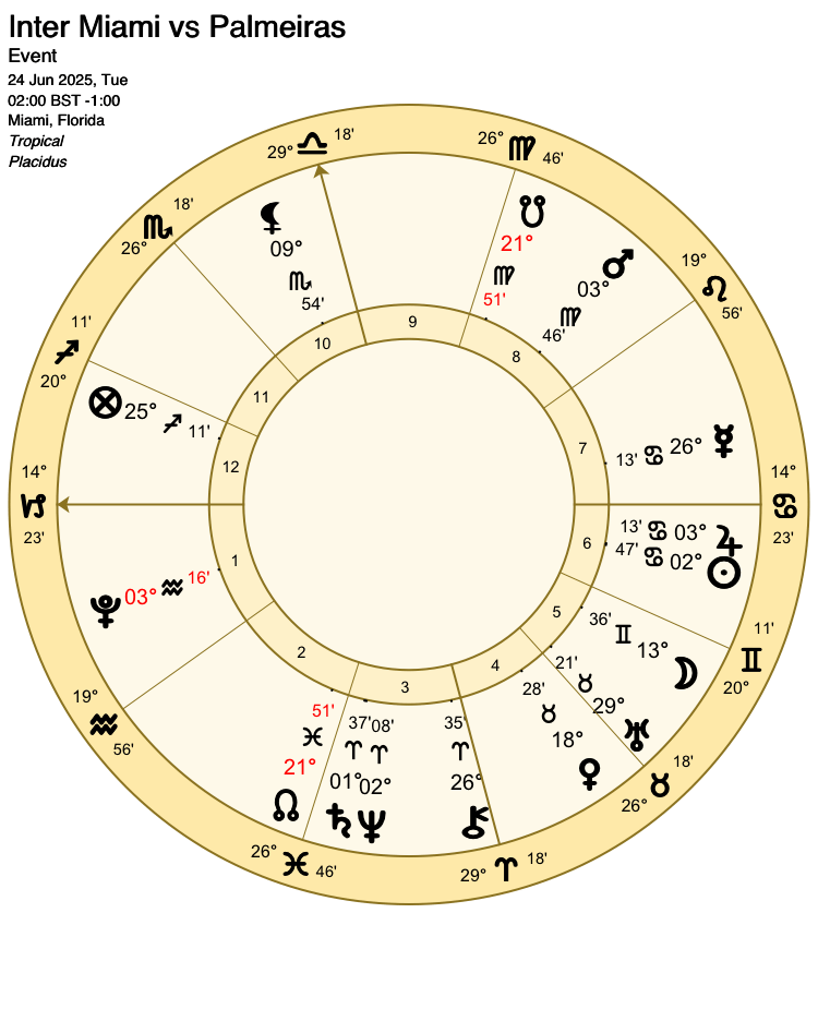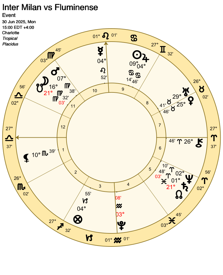 As favourites, Inter Milan are represented by Venus (lord of the 1st house) and the Sun (ruler of the 10th house, the house of victory for the favourites).