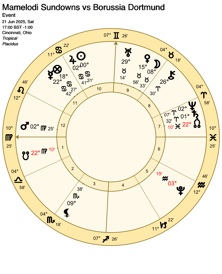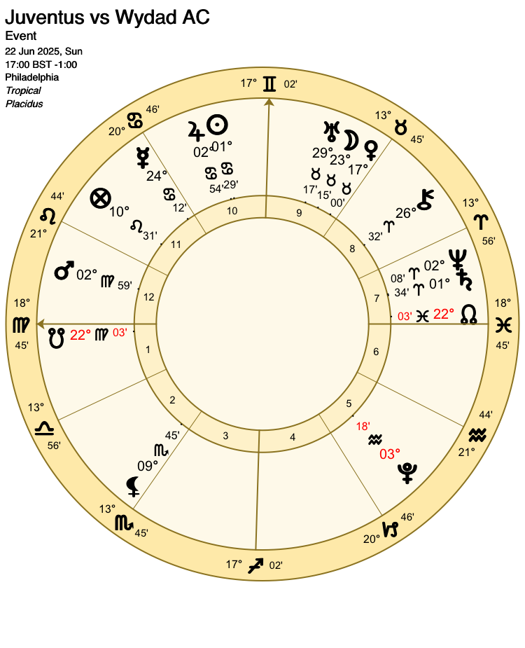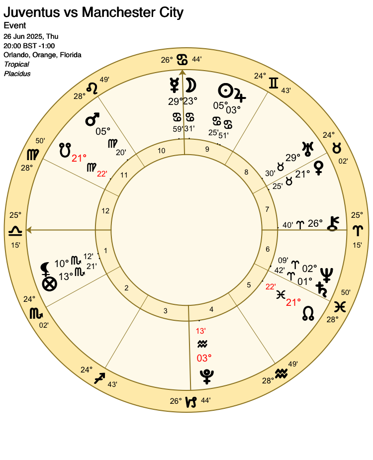 As favourites, Inter Milan are represented by Venus (lord of the 1st house) and the Sun (ruler of the 10th house, the house of victory for the favourites).