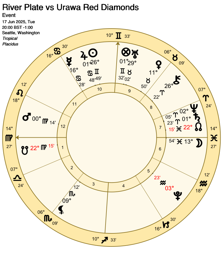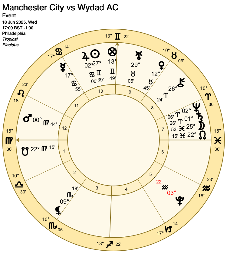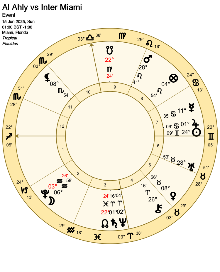 As favourites, Atletico Madrid are signified by Venus (lord 1). The Moon (ruler of the 10th house, the house of victory for the favourites) already has a key role describing the events of the match, so Venus is their sole representative for this match.