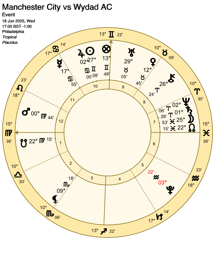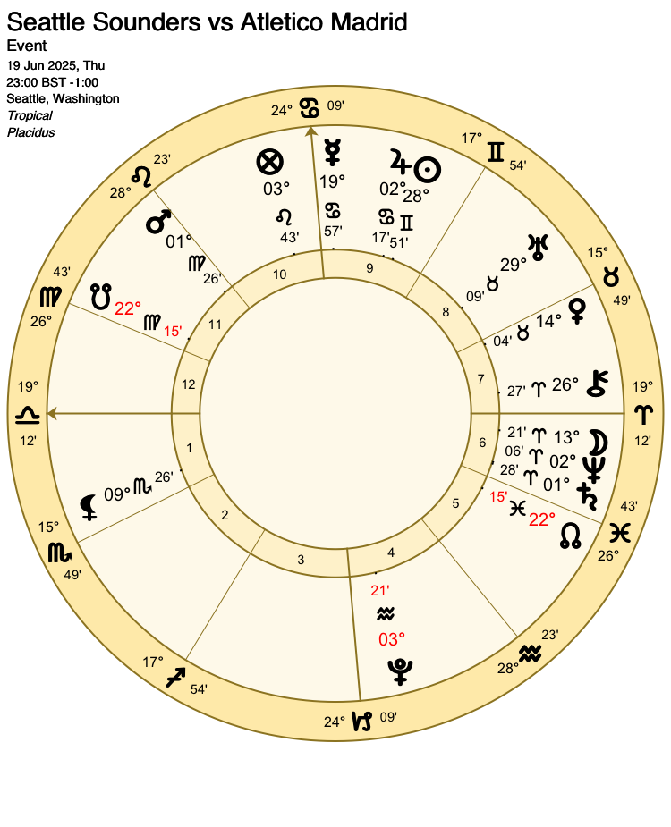 Saturn (lord 4 for Seattle) is placed very close to Neptune. Neptune has proven himself to be a ‘wild card’ in football matches. He is known to cause upsets, but can be inconsistent in the way he works. John Frawley notes that, like Pluto and Uranus, he seems to work against the favourites, if he is inclined to work at all. Here Saturn applies to conjunction with Neptune, but turns retrograde before the aspect perfects (becomes exact), so may be no more relevant to the outcome than Pluto’s opposition with the Part of Fortune. However, Neptune may yet cast an air of mystery and unpredictability over the match.