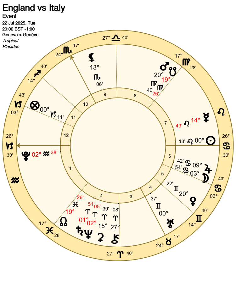 The Moon’s only aspect of relevance is a conjunction with the antiscion of Venus at 09 Cancer 38. At over 5-degrees distant, this aspect, which favours Italy, is outside the usual orb of reliability for a 90-minute football match. However, it may come into play should the game include extra time or penalties. England will need to be especially vigilant during the latter stages of the game.