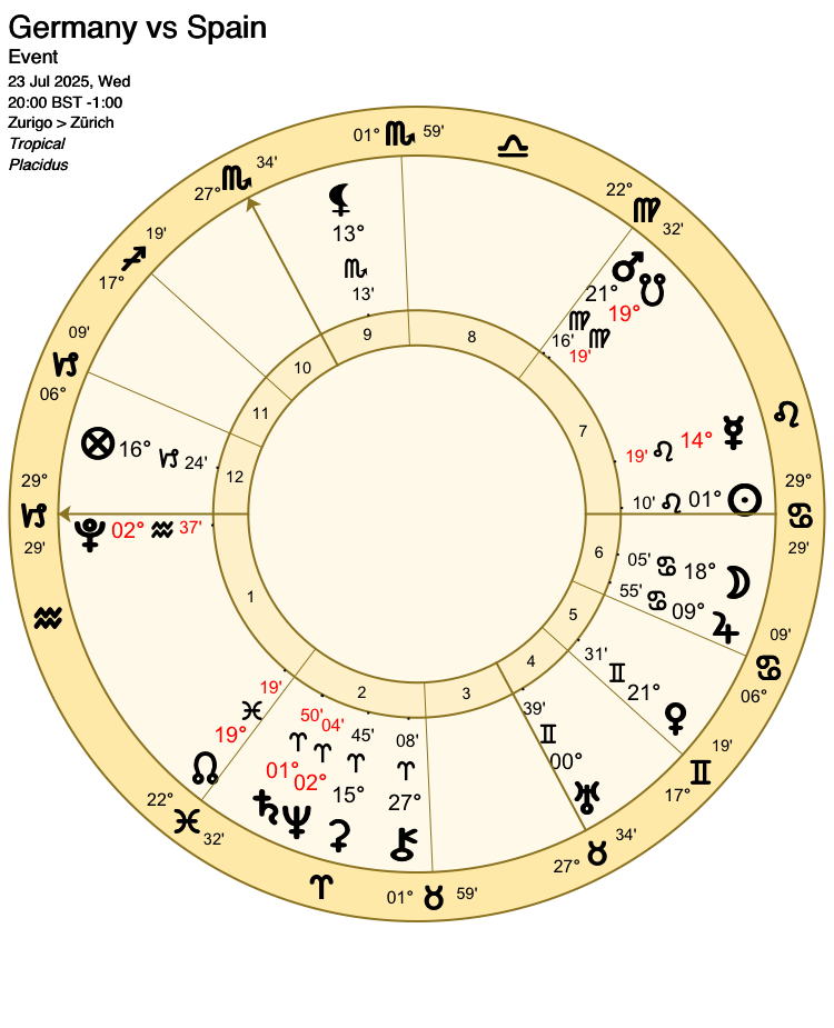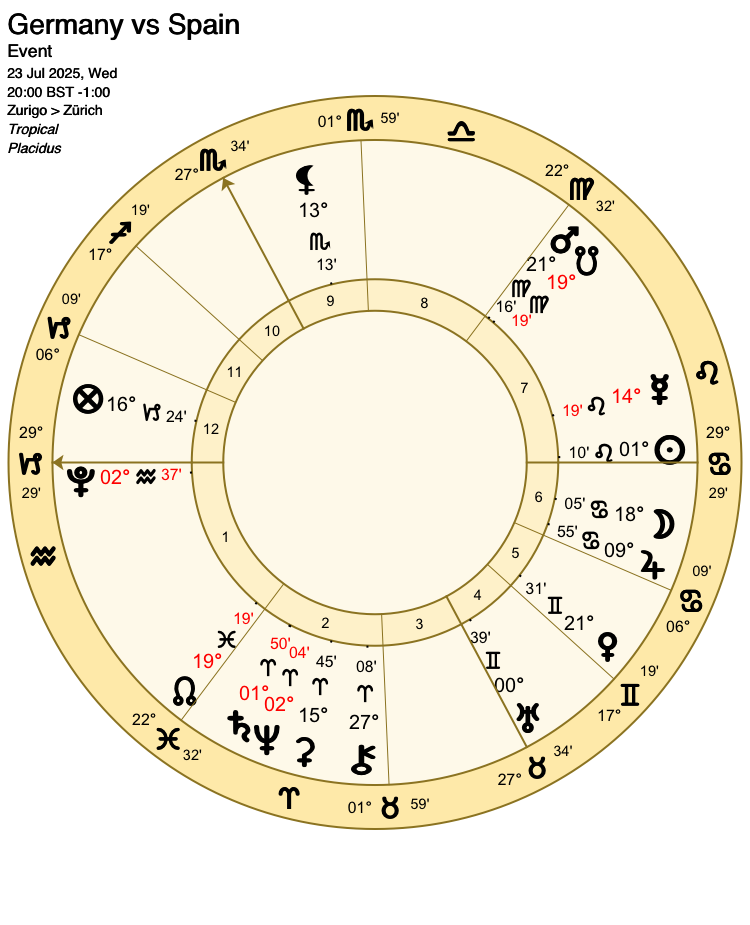 The Moon’s final aspect (over her usual 5-degree orb of reliability for a 90-minute football match) is often key to the result. Here, her final aspect is a sextile to Venus, ruler of either the 4th house (for Germany, if the match kicks off on time), or the 10th house (for Spain, if the match starts late).