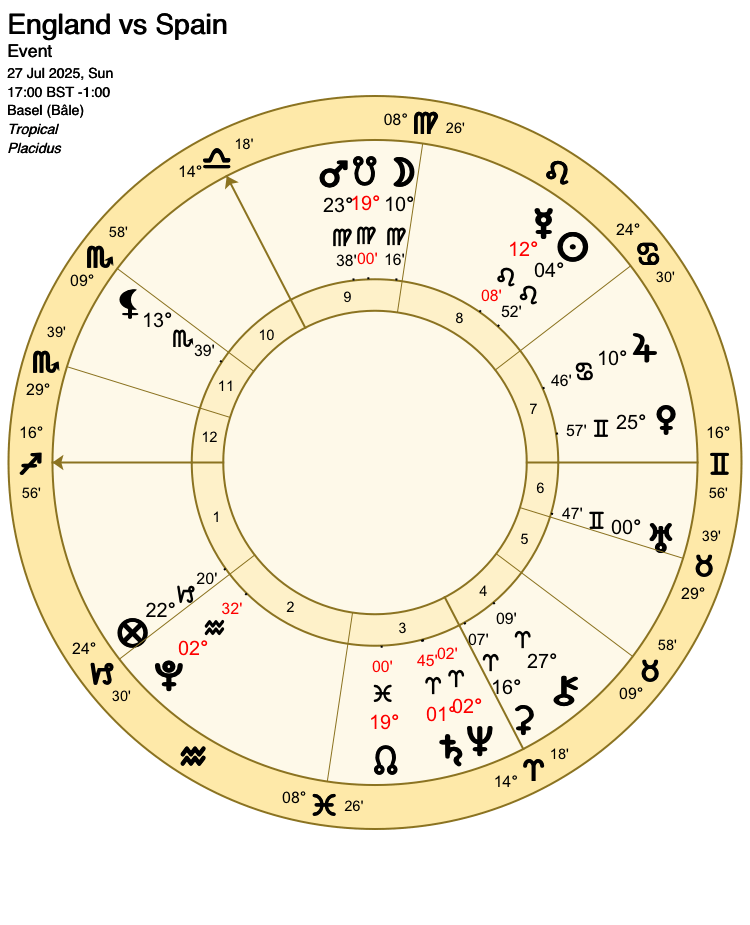 And help they will need: The applying conjunction between Mars (lord of the 10th house) and the malefic South Node has potential to be a major-stumbling block. The poison in the Dragon’s Tail certainly thwarted Sweden’s ambitions in their Quarter-final penalty shootout against England on 17th July. Now by a twist of fate, England find themselves facing the same obstacle. (Note added 20th July 2025 – France also fell foul of the baleful influence of the South Node in yesterday evening’s Quarter Final. They were hot favourites to win, but lost to Germany on penalties.)