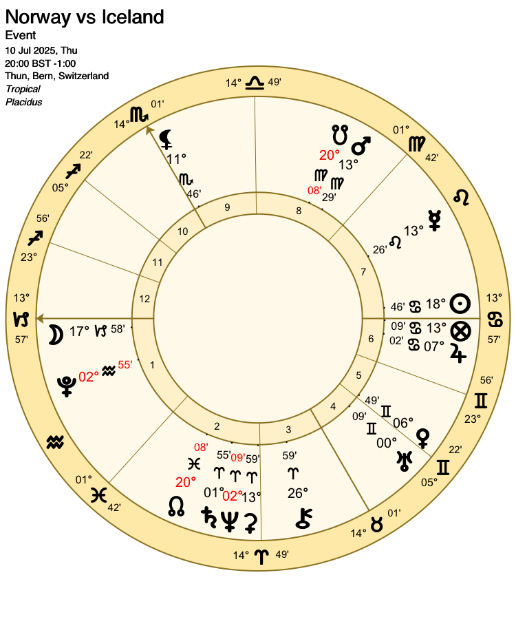 If the game started earlier, the Moon’s opposition to the part of Fortune would be equally helpful for the underdogs (Iceland). However, by the time the game kicks off, this aspect will already be past.