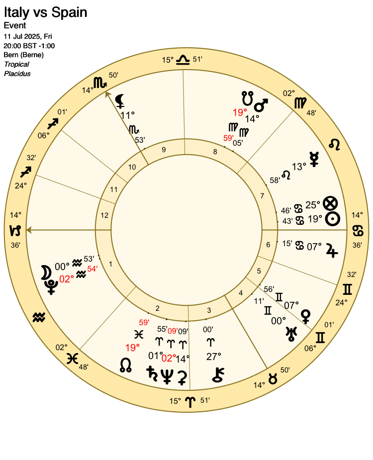 However, the Moon then runs straight into a conjunction with Pluto. This is bad news for Spain, as Pluto is known to reserve his malice for the most favoured team. In contest charts, the Moon describes the general flow of events, so Pluto’s detriment is more generalised than if either of Spain’s planets (Saturn or Mars) were directly involved. Nevertheless, this conjunction is a warning that Spain will find this game tougher than they may expect.
