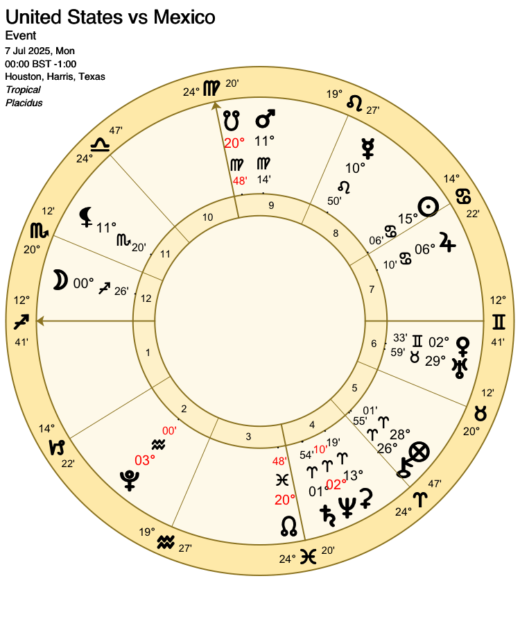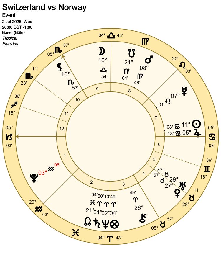 The Moon applies to a trine with Mars (lord 1) but, at over 7 degrees distant, is over the 5-degree orb considered most reliable for a 90-minute football match. However, as extra time (and possibly penalties) are allowed, this could indicate a late advantage for the favourites.