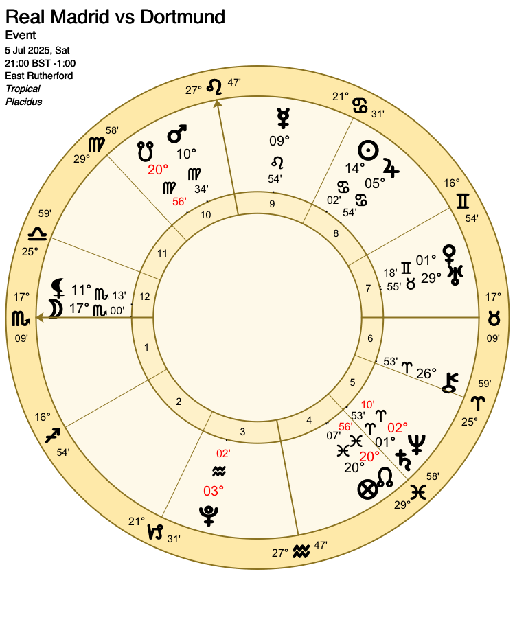 Opponents Real Madrid are signified by Venus, (lord of the 7th house) and Saturn (lord of the 4th house).