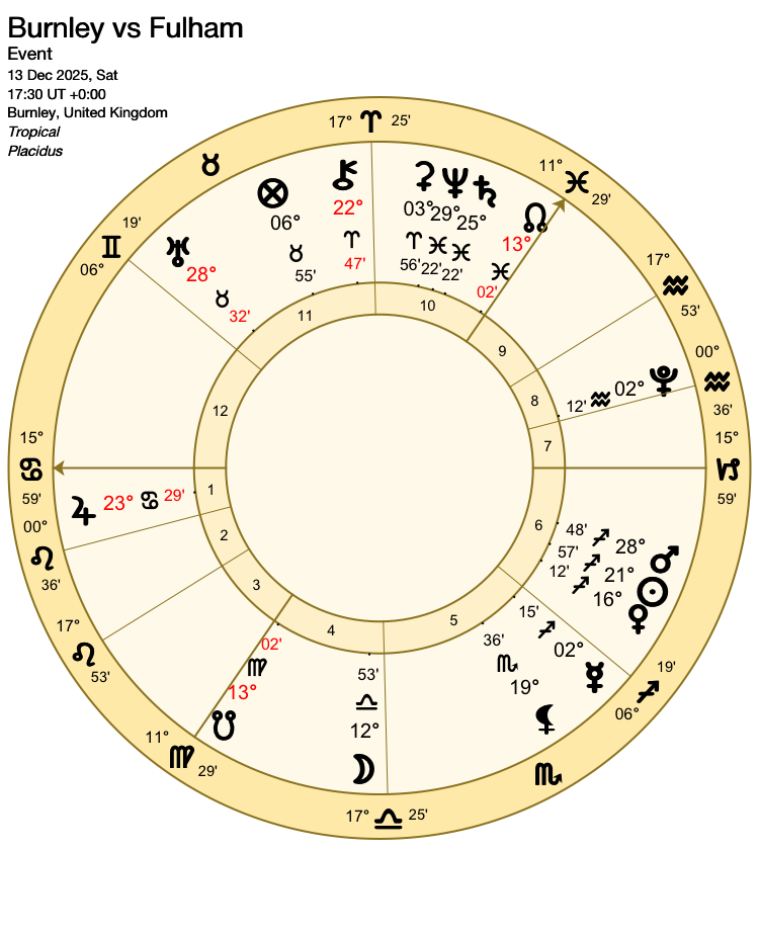 On balance, Jupiter is closer to the 1st house cusp than Saturn is to the 10th, which should give Liverpool the edge. However, Saturn’s influence for Spurs is strong and should not be underestimated.