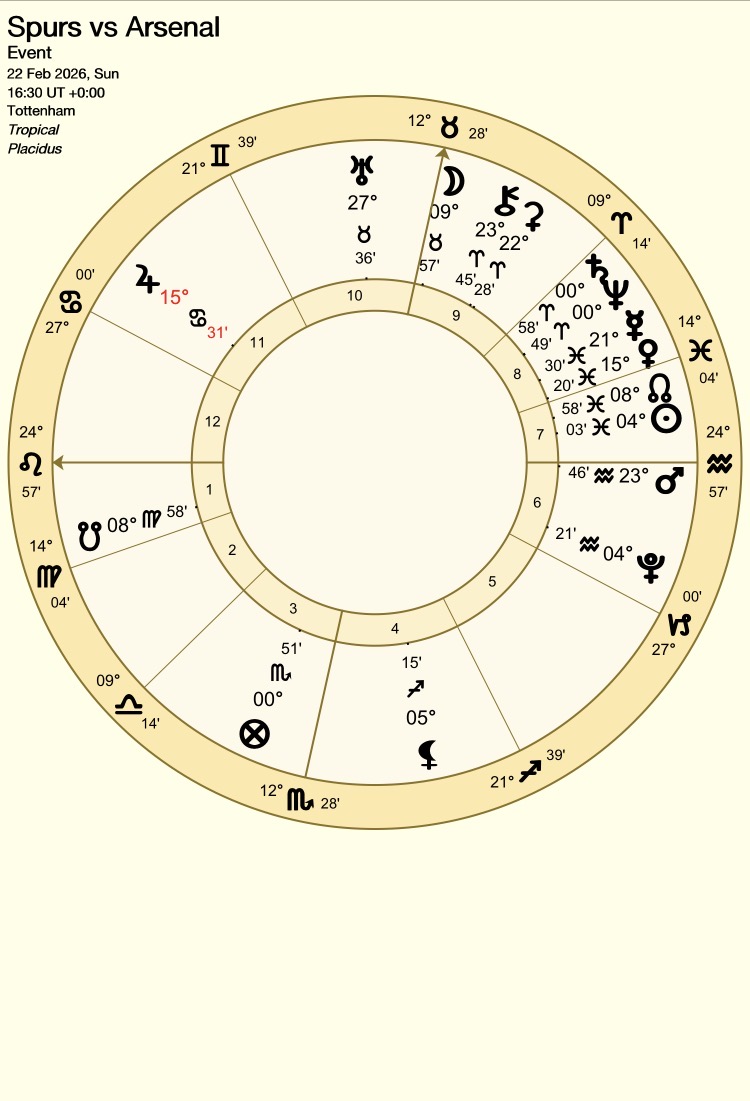 There are two testimonies which are helpful to Spurs, but these are not as strong as those favouring Arsenal; Firstly, there is the placement of Mars, ruler of the 4th cusp (the house of victory for the underdogs) on the 7th house cusp: This suggests that Spurs will play well but is no guarantee of victory.