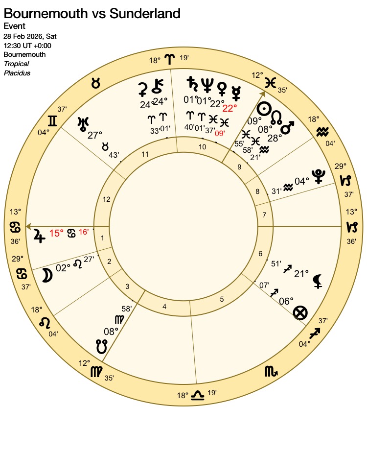 Furthermore, retrograde Jupiter (the ruler of the 10th house of victory) is placed in the 1st house and applies to conjunct the 1st house cusp. With strong testimonies in their favour, Bournemouth could be forgiven for thinking that the match is already in the bag.