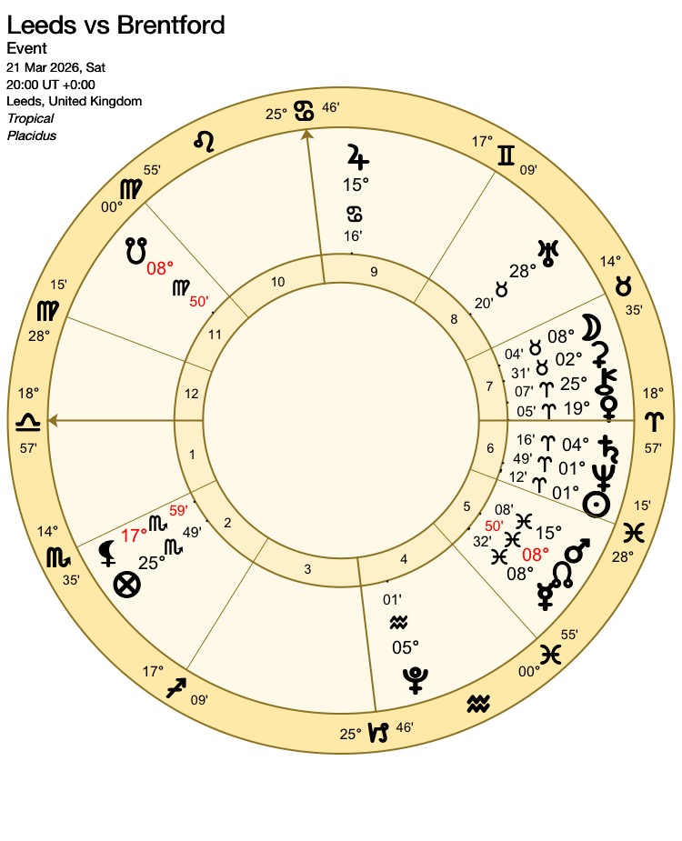 The Moon, whose aspects decide the winner of contest charts more often than any other testimony, makes no aspects over the 5-degree orb considered most reliable for 90-minute football matches. When she travels a little further (over 7 degrees) she makes a sextile to Mars (ruler of the 7th house) suggesting a possible late advantage for the underdogs/visitors, especially if the match strays into extra time.