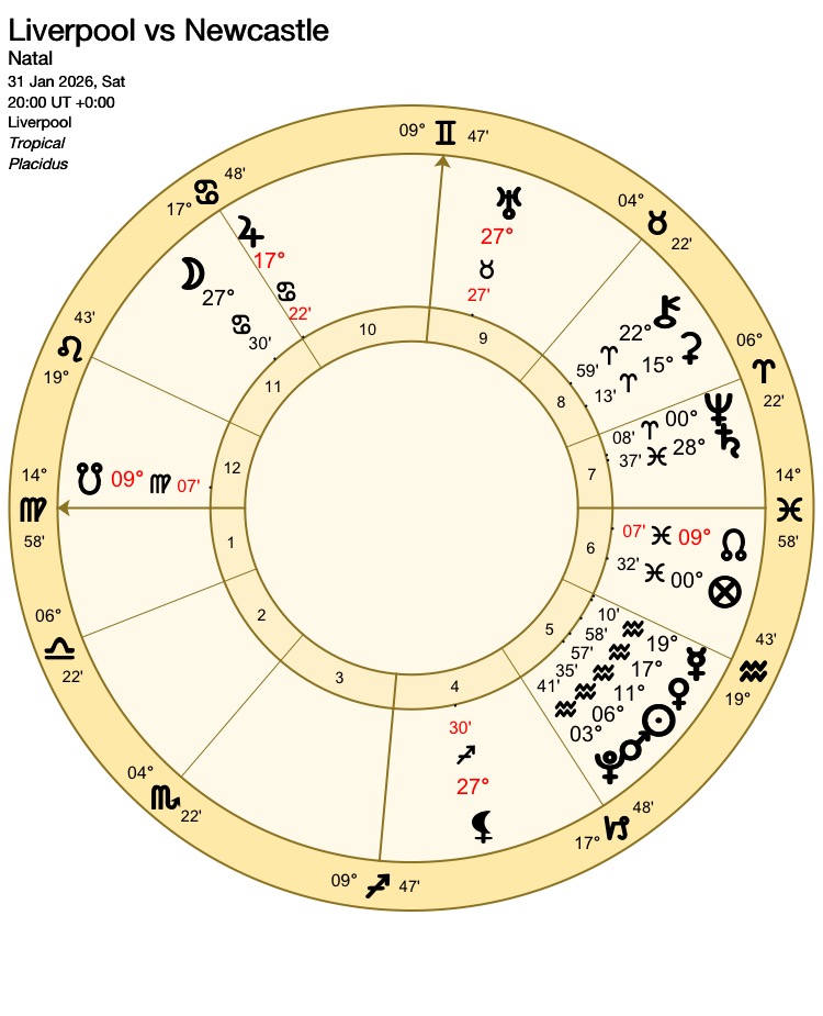 Astrological Football Forecast for the Premier League: Saturday 31st January 2026 Liverpool vs Newcastle