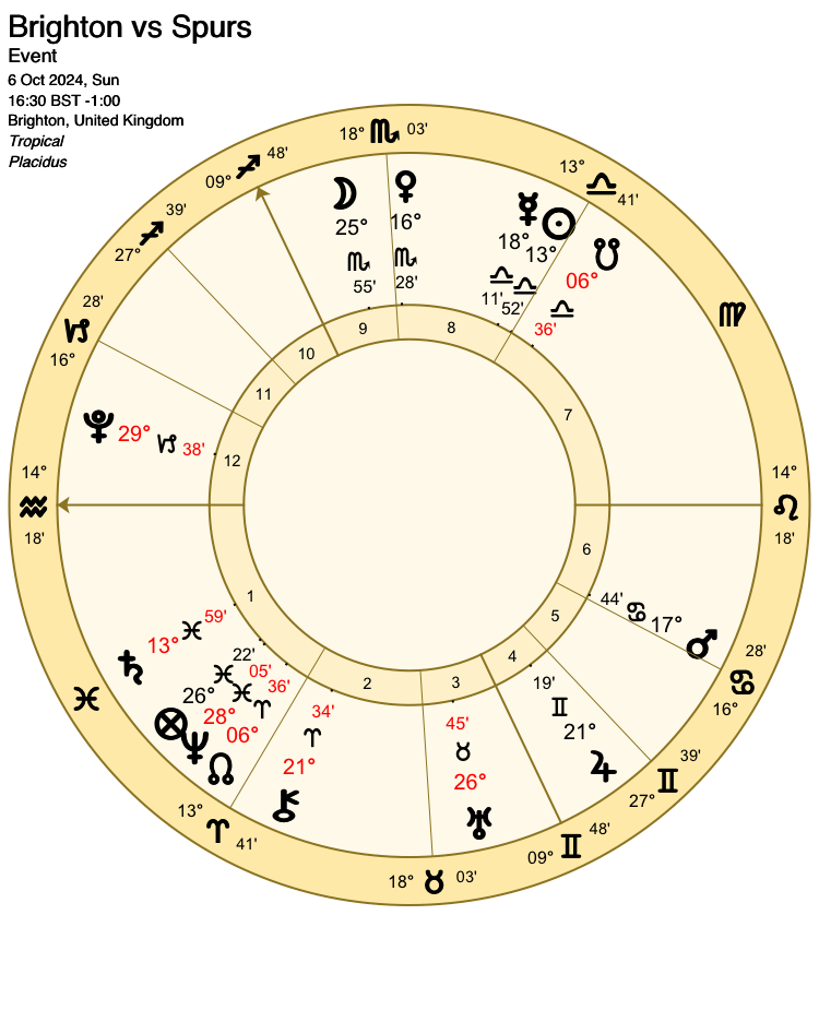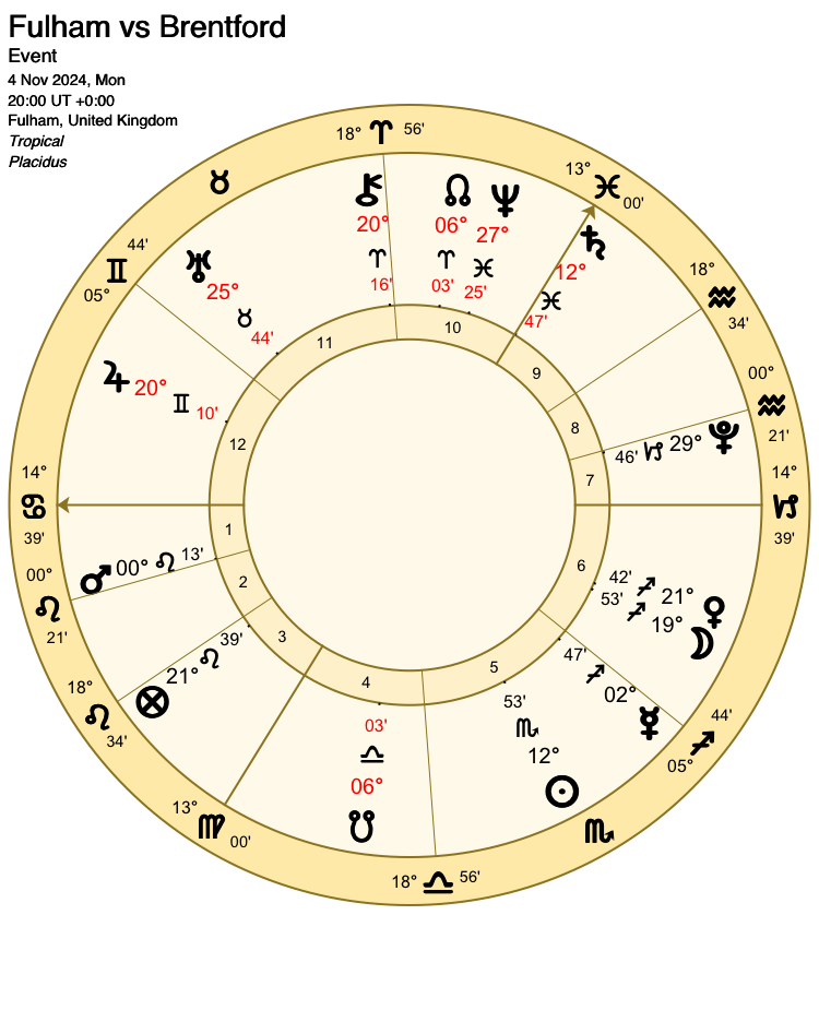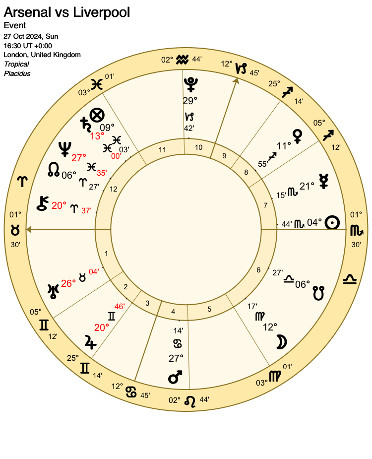 As the game takes place around the time of the New Moon, the Part of Fortune is in the 1st house. This might seem fortunate for the favourites; but the placement of the Part of Fortune is linked to the Moon’s current phase and always occupies the 1st house at the New Moon. Observation shows that wins for the favourites do not always correlate with a New Moon, so the Part of Fortune’s placement by antiscion (which varies from month to month as the New Moon changes sign) is considered more significant in contest charts than her bodily placement.