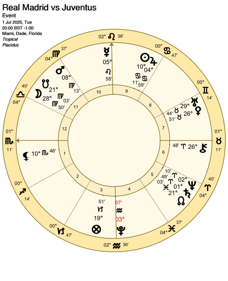 Here, Neptune is retrograde and almost conjunct Saturn (lord 1, for Italy). The aspect never perfects, as Saturn is also retrograde. However, the planets are close enough to be worth noting. In the Club World Cup final on 13th July 2025, Neptune certainly a powerful ally to Chelsea who, despite being the underdogs, trounced favourites Paris Saint Germain three goals to nil.