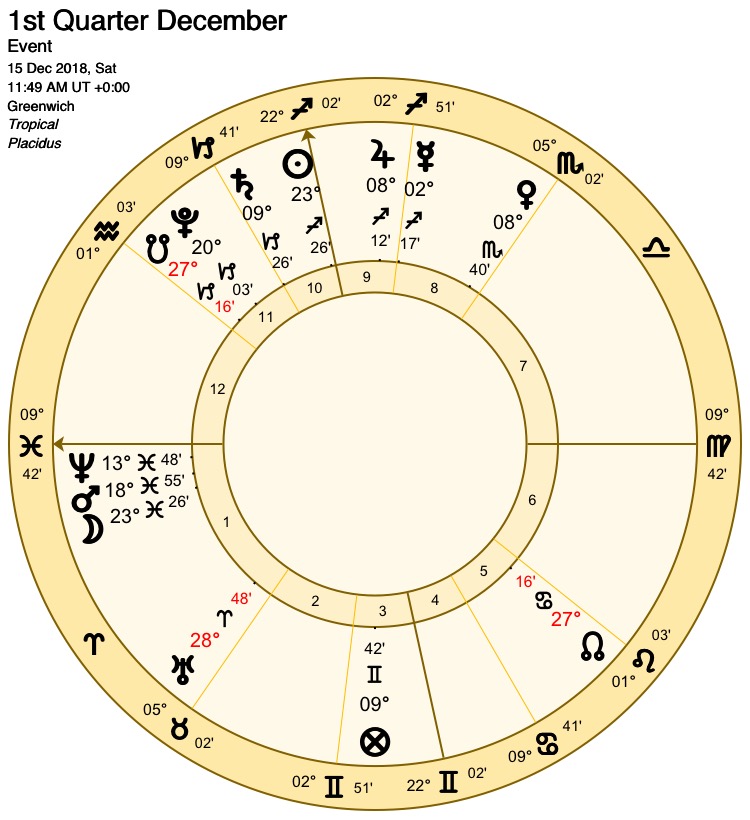 The lunar mansion which holds sway over 15 Capricorn 25 is the 23rd, called S’ad Bula: “The Fortune of the Glutton”. The unfortunate reputation of the Moon in this Mansion may be attributed to her being in the sign of her detriment in Capricorn, a debilitation which tarnishes the expression of the positive energies of Mars, and which, according to the Picatrix, makes the Mansion fit only for talismans dedicated to works of discord and destruction. Additionally, the Moon here seems to dilute the strength of Saturn (ruler of Capricorn) , although with potentially positive results: The dissolution of boundaries inherent in the Moon’s placement in this Mansion is noted by Cornelius Agrippa as useful in magic aimed at liberating captives.